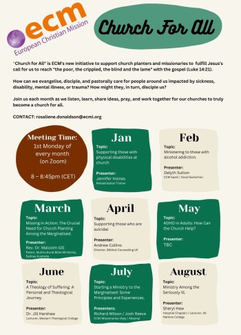 Within ECMI we have established a monthly online group to help Christians and churches disciple those affected by disability, addiction, mental health issues, etc. The group aims to raise awareness on disability, provide training, and come alongside to explore how people living with disabilities can be reached, supported and fully included.